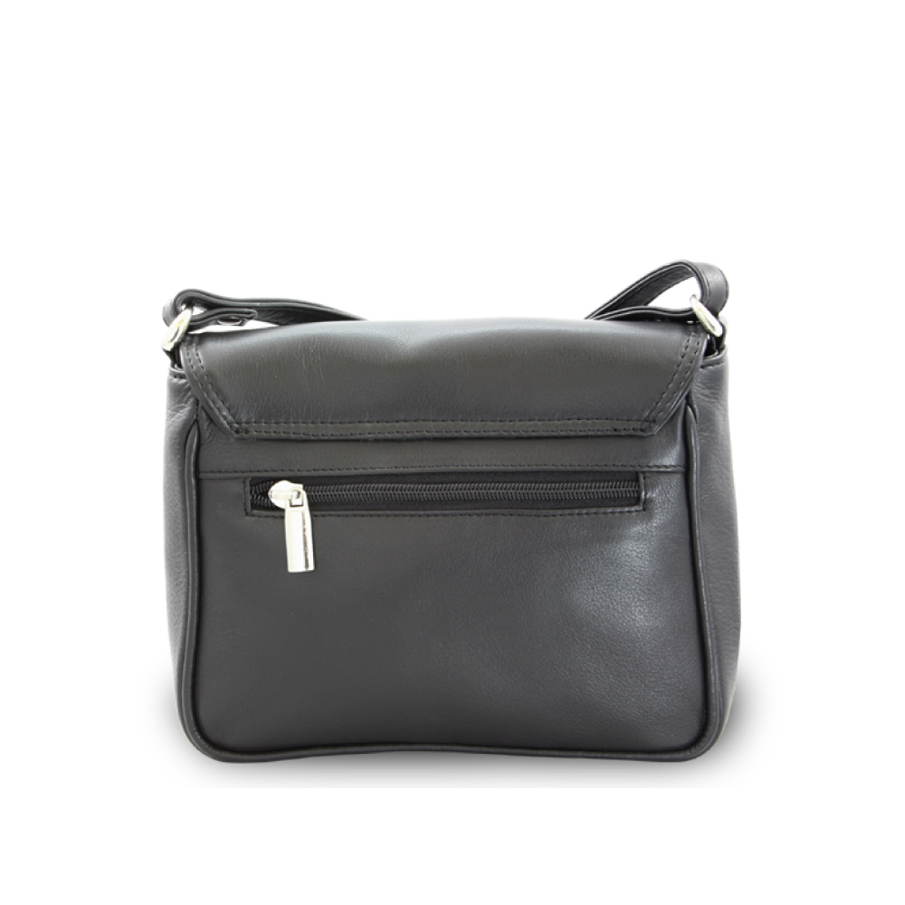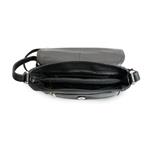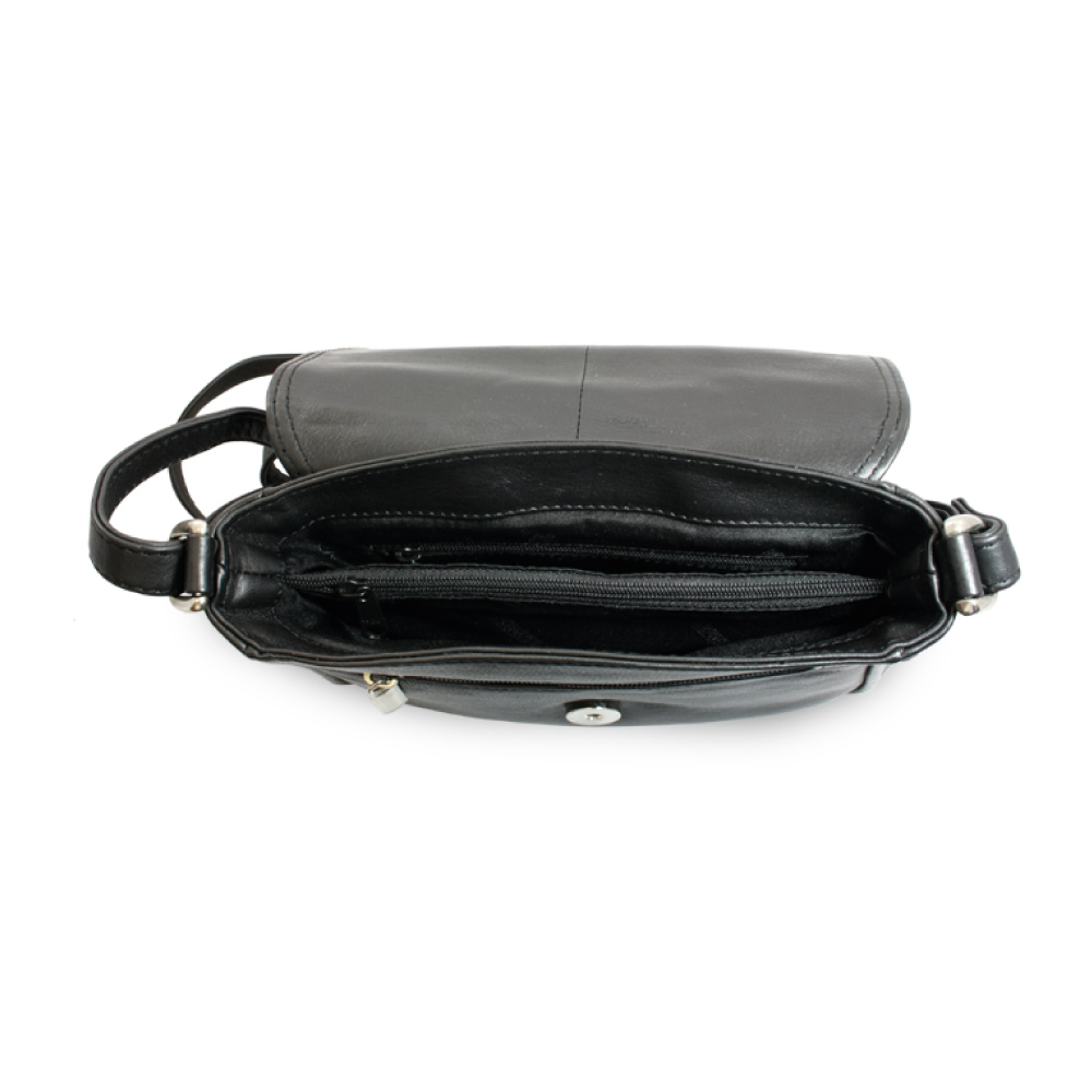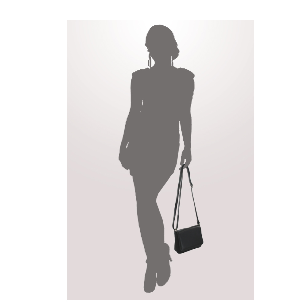 Dvě vnitřní separace rozdělené zipovou kapsou, malá zipová kapsa uvnitř, zipová kapsa pod klopnou a na zadní straně kabelky, malé zrcadlo v koženém obalu, magnetický zámeček, nastavitelný popruh. Základní rozměr 21 x 18 x 6 cm. Materiál NDM, barva černá.