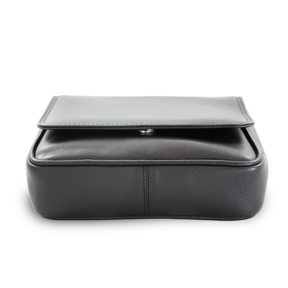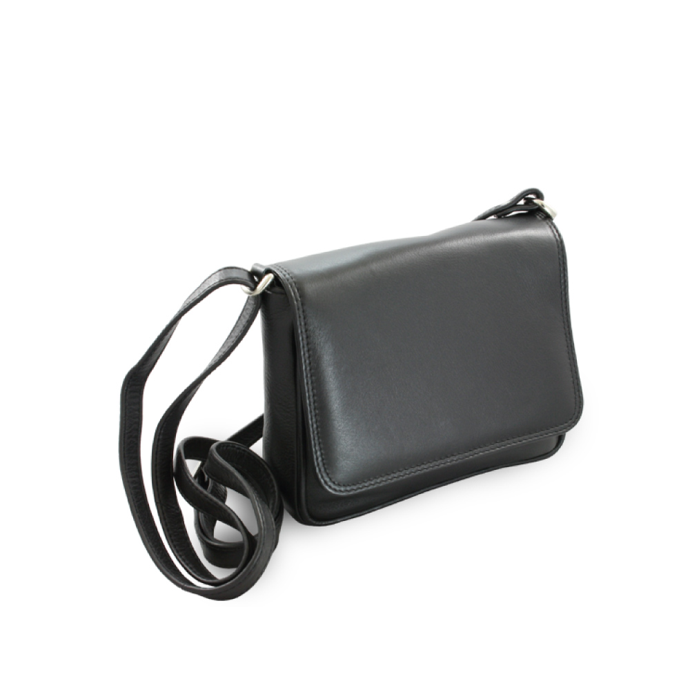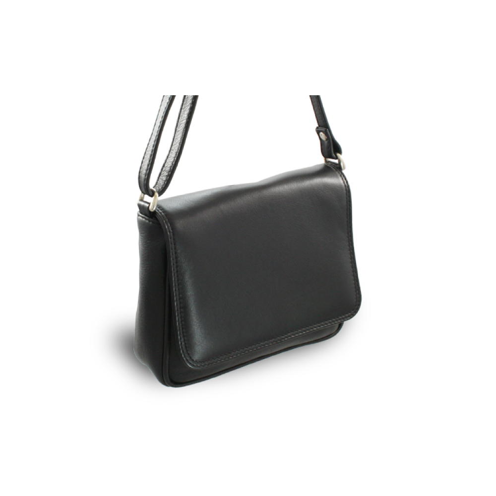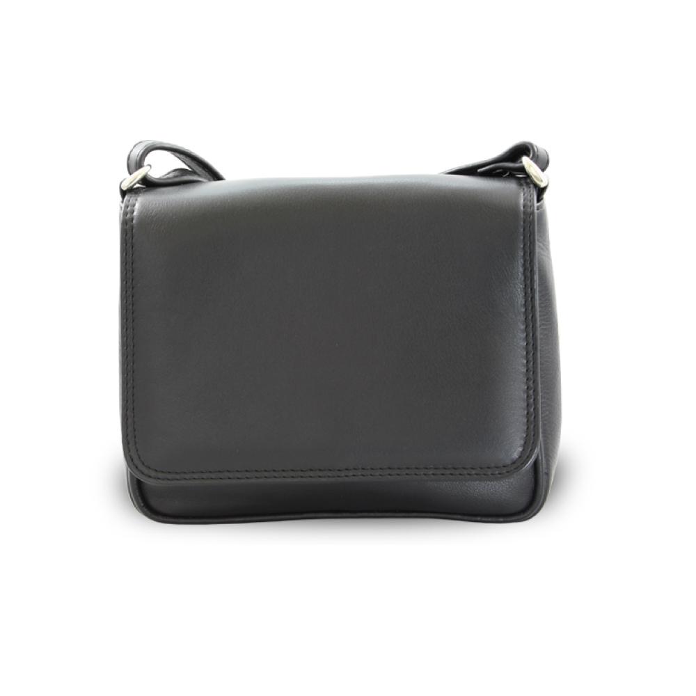 Dvě vnitřní separace rozdělené zipovou kapsou, malá zipová kapsa uvnitř, zipová kapsa pod klopnou a na zadní straně kabelky, malé zrcadlo v koženém obalu, magnetický zámeček, nastavitelný popruh. Základní rozměr 21 x 18 x 6 cm. Materiál NDM, barva černá.