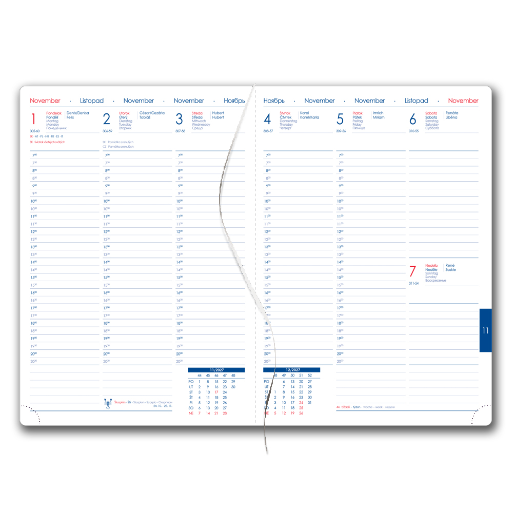 Diář obsahuje: kulaté odtrhávací rožky, bílou záložku a propisku