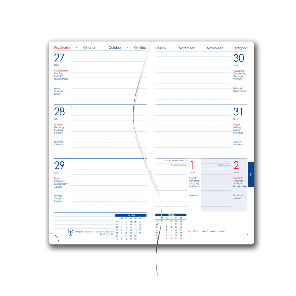 Diář obsahuje: kulaté odtrhávací rožky, bílou záložku,