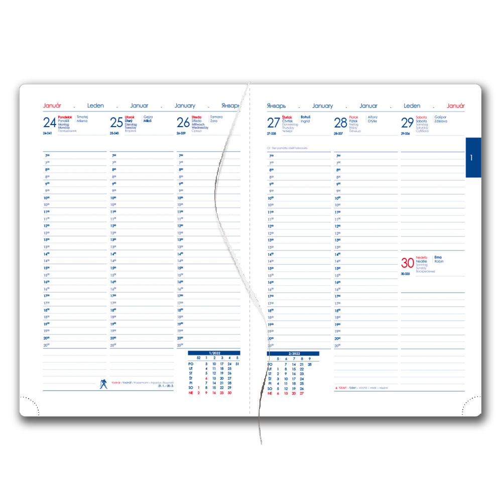 Diář obsahuje: kulaté odtrhávací rožky, bílou záložku,