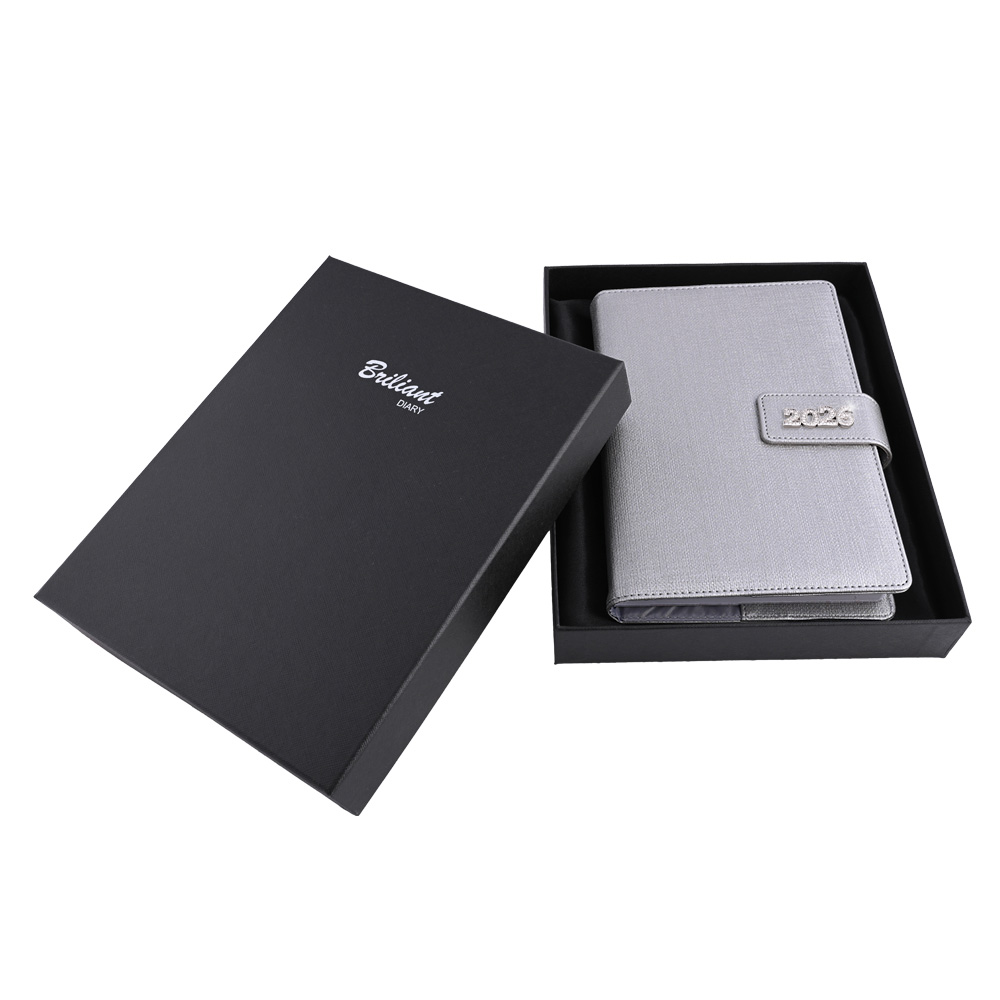 Diář je balen v dárkové krabičce vystalné saténem.
