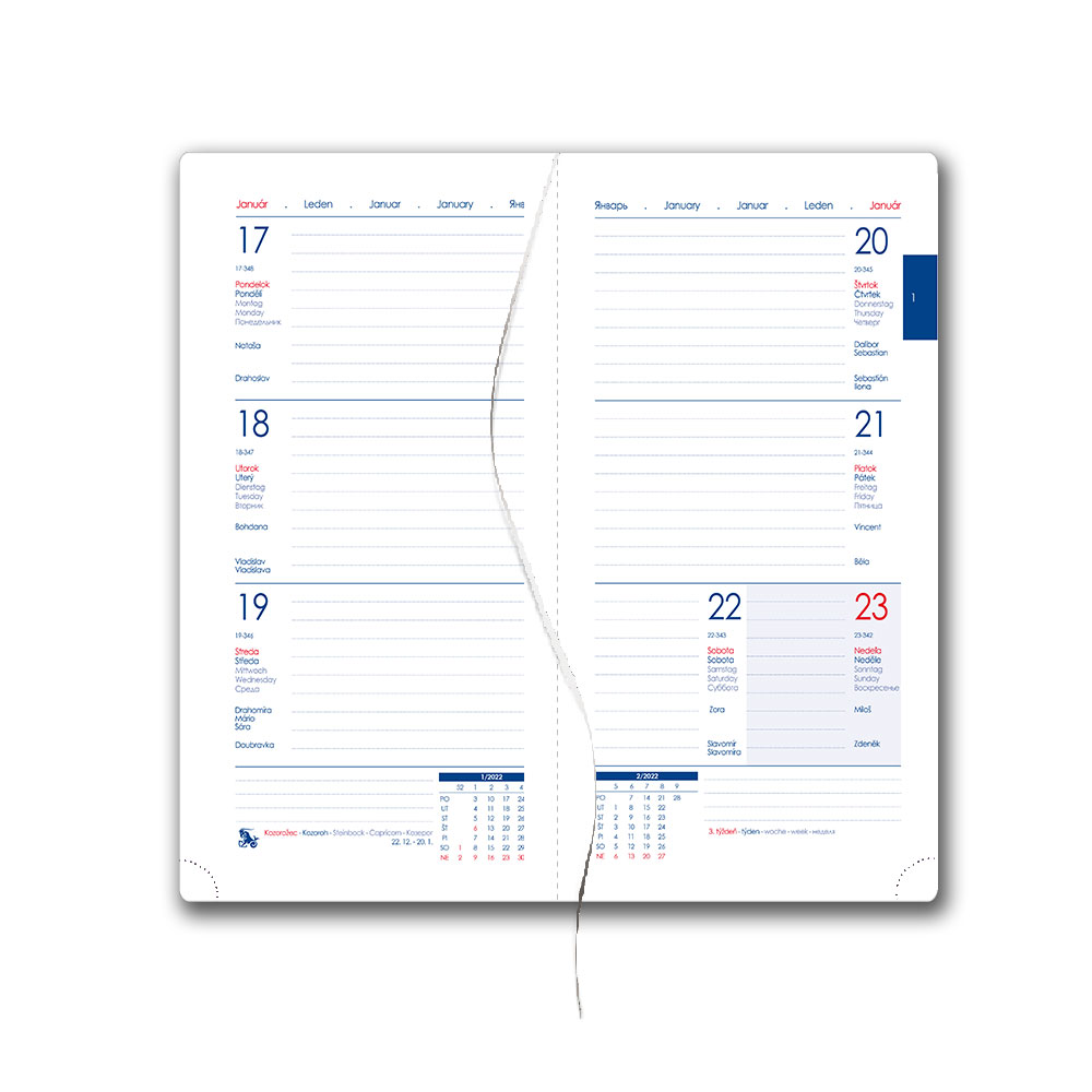 Diář obsahuje: kulaté odtrhávací rožky, bílou záložku,
