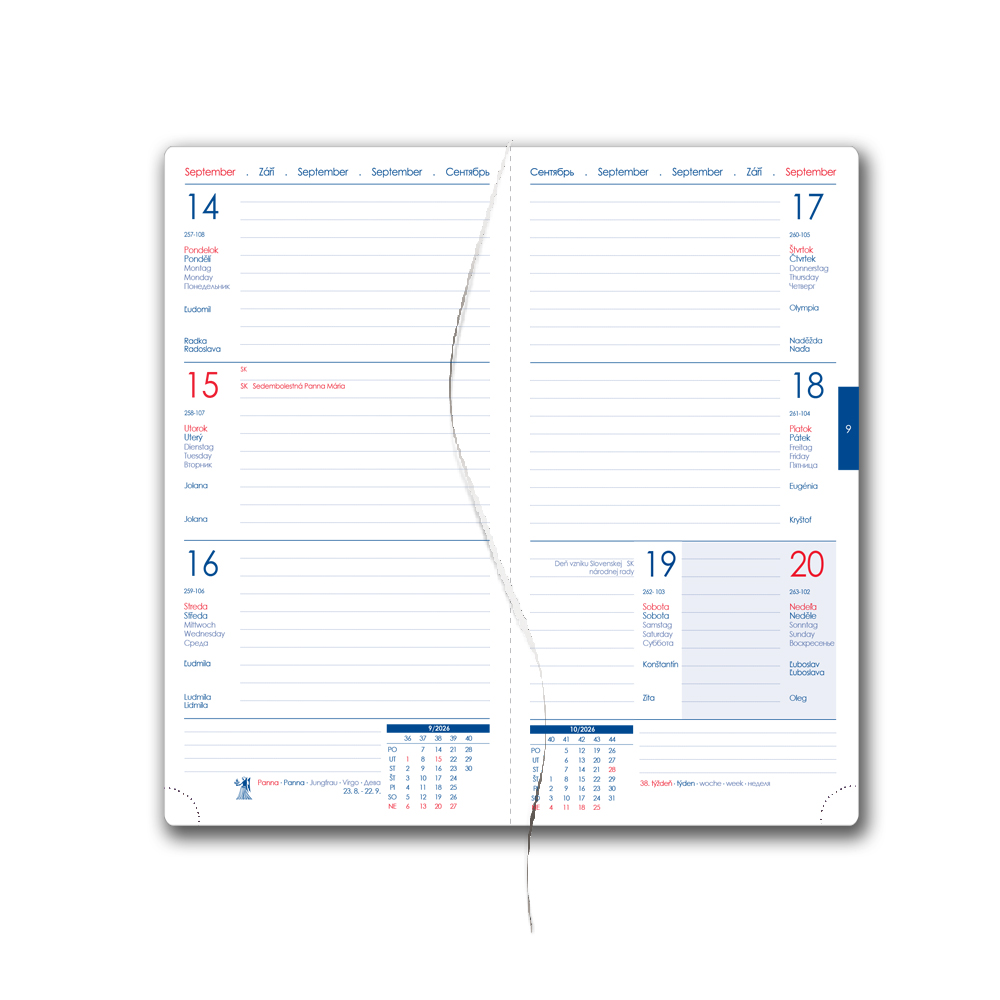 Diář obsahuje: kulaté odtrhávací rožky, bílou záložku a propisku