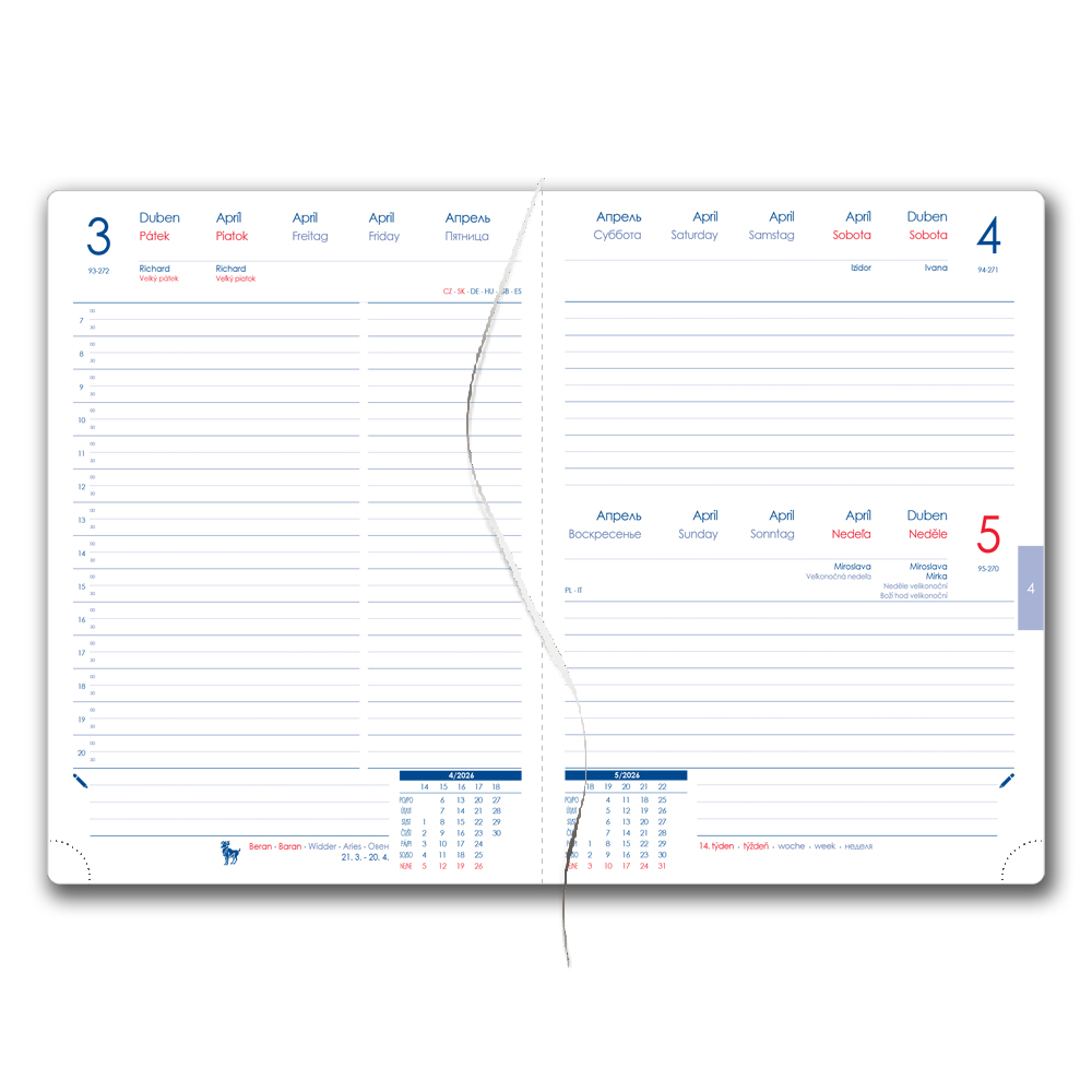 Diář obsahuje: kulaté odtrhávací rožky, bílou záložku a propisku