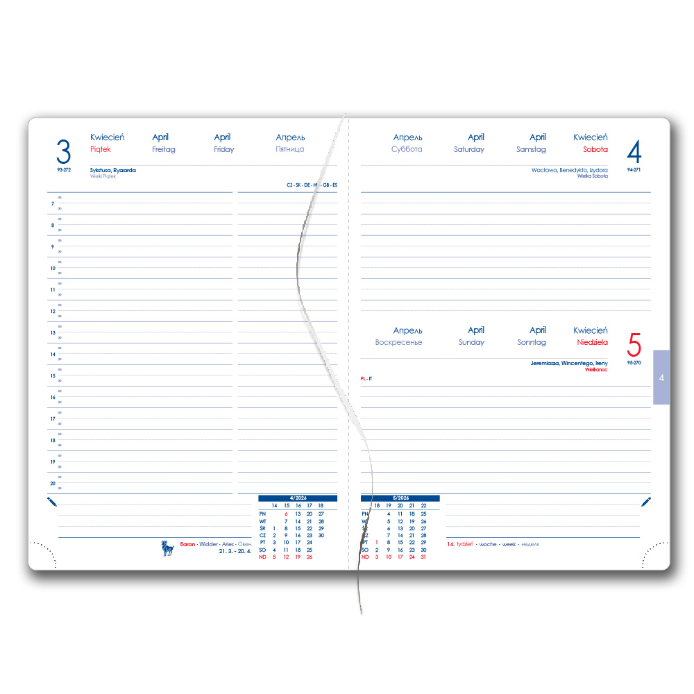 Diář obsahuje: kulaté odtrhávací rožky, bílou záložku a propisku