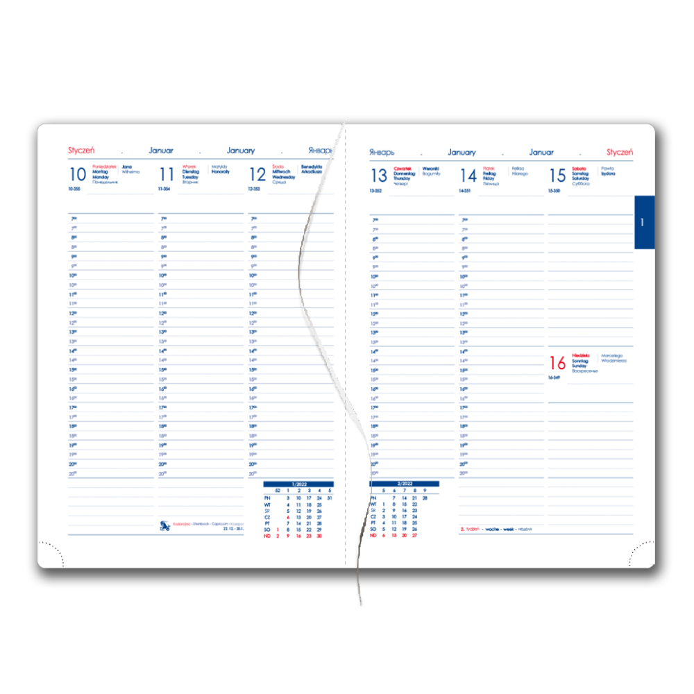 Diář obsahuje: kulaté odtrhávací rožky, bílou záložku a propisku