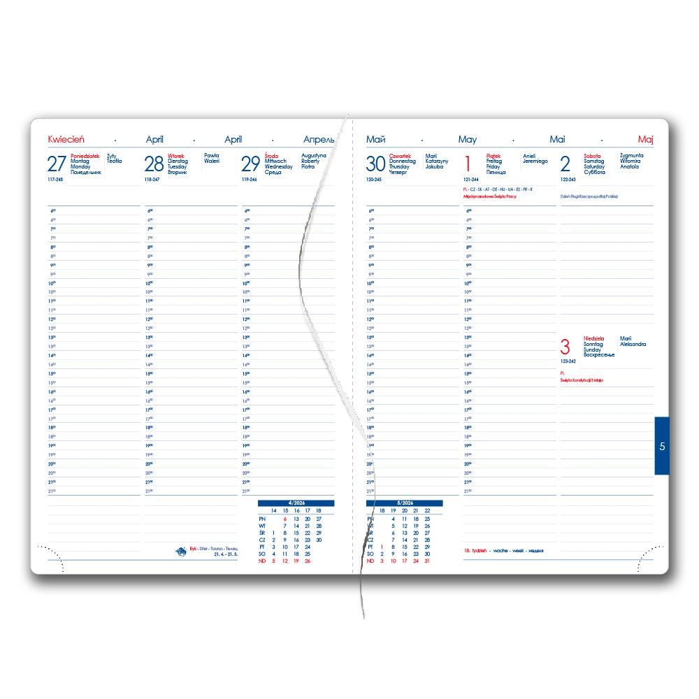 Diář obsahuje: kulaté odtrhávací rožky, bílou záložku a propisku