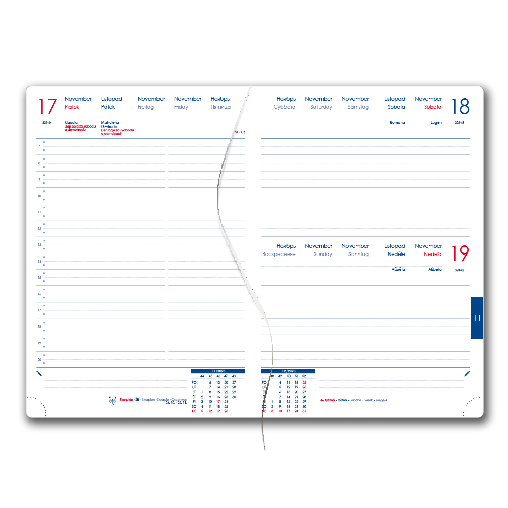 Diář obsahuje: kulaté odtrhávací rožky, bílou záložku a propisku