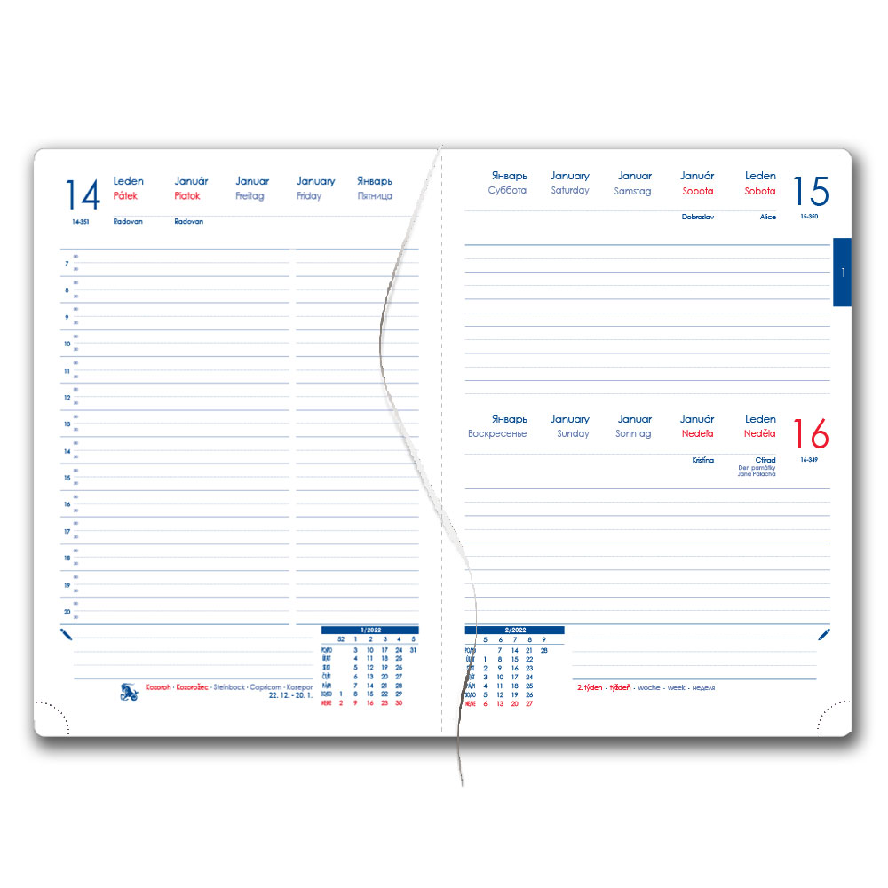 Diár obsahuje: okrúhle odtrhávací rožky,bílou záložku a propisku