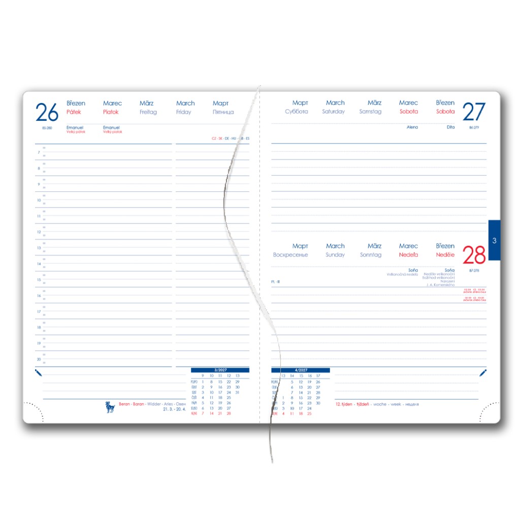 Diář obsahuje: kulaté odtrhávací rožky, bílou záložku a propisku