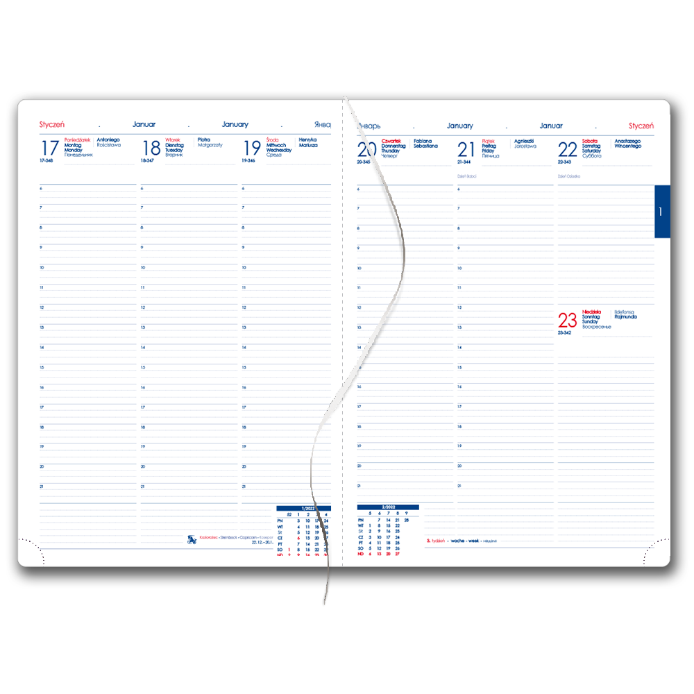 Diář obsahuje: kulaté odtrhávací rožky, bílou záložku a propisku