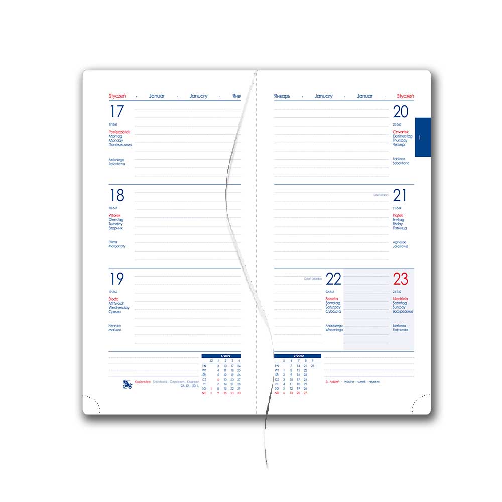 Diář obsahuje: kulaté odtrhávací rožky, bílou záložku a propisku