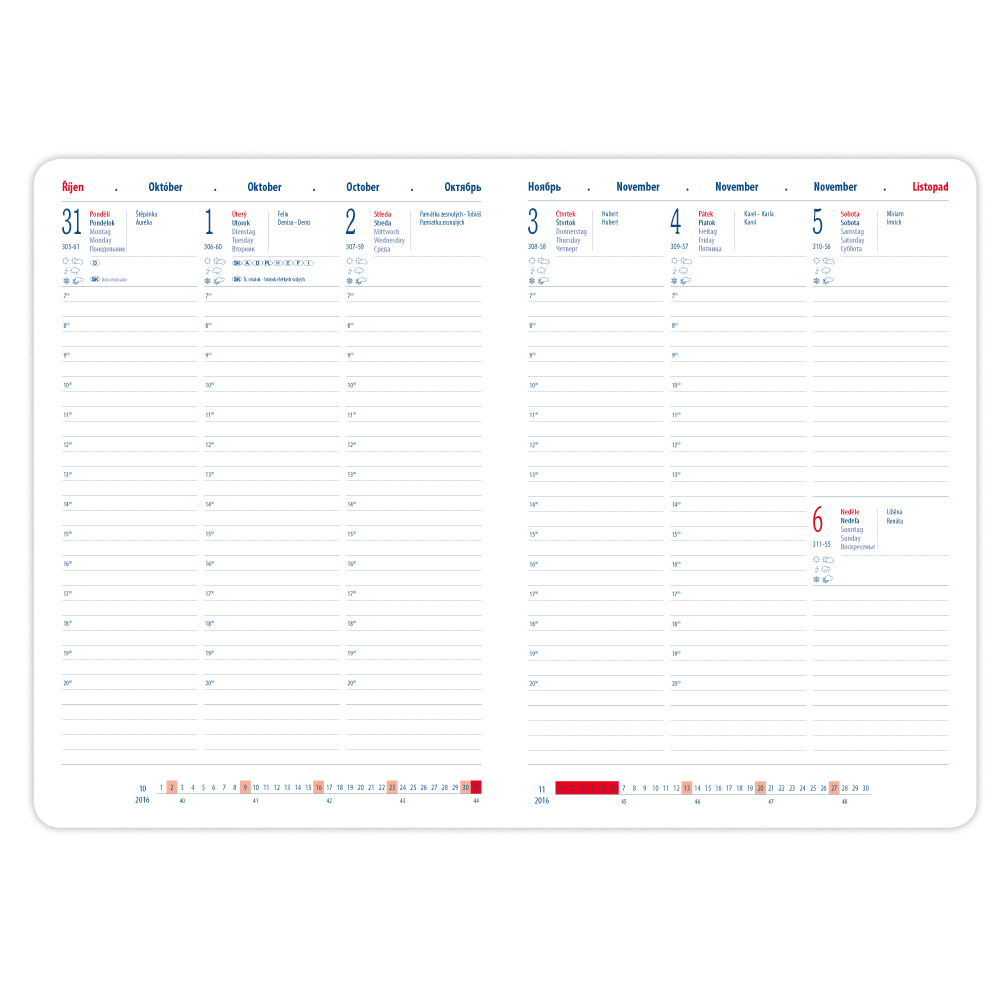 Diáře na rok 2016 také obsahují: vzdálenosti v km EU/CZ/SK, poznámky, měsíční poznámky