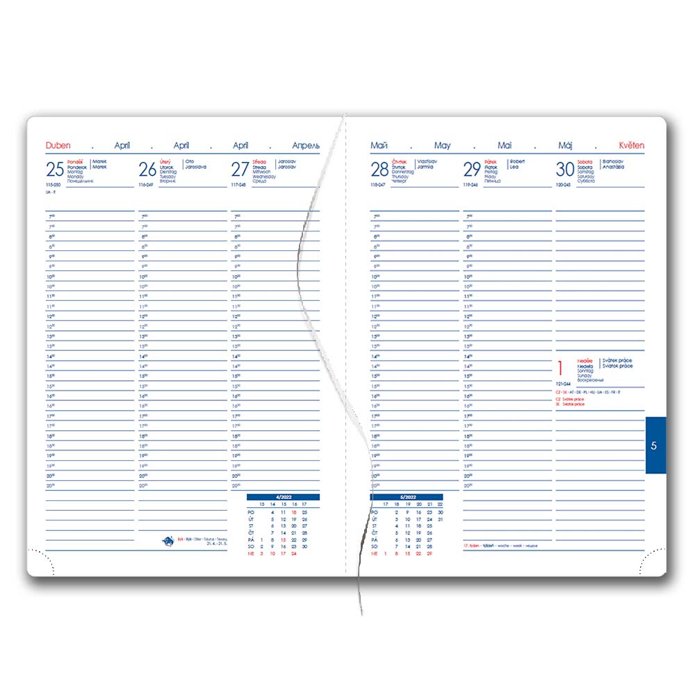 Diář obsahuje: kulaté odtrhávací rožky a bílou záložku