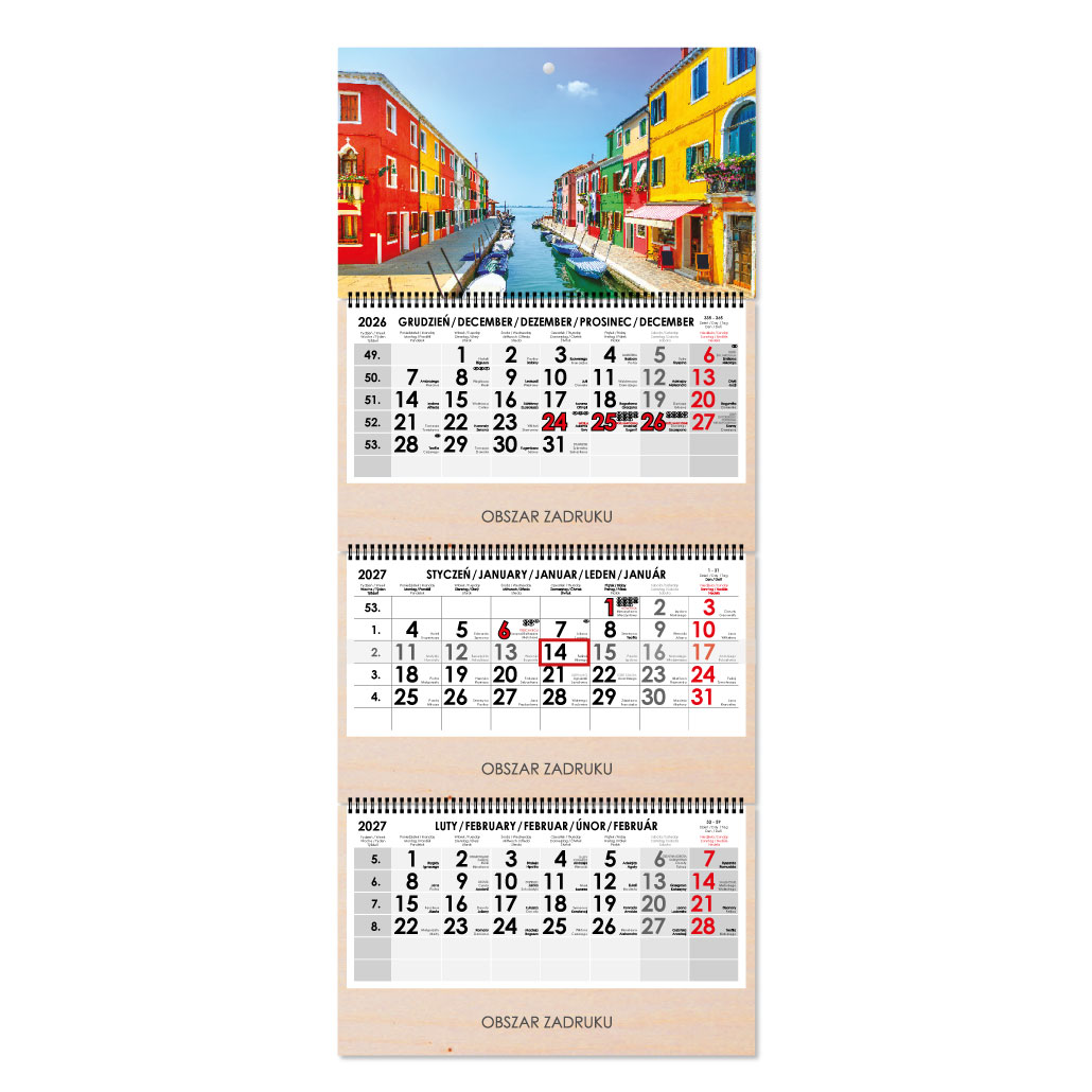 Dřevěný tříměsíční kalendář Trio Wood Benátky skládaný polský se spirálou 2027 - šedý