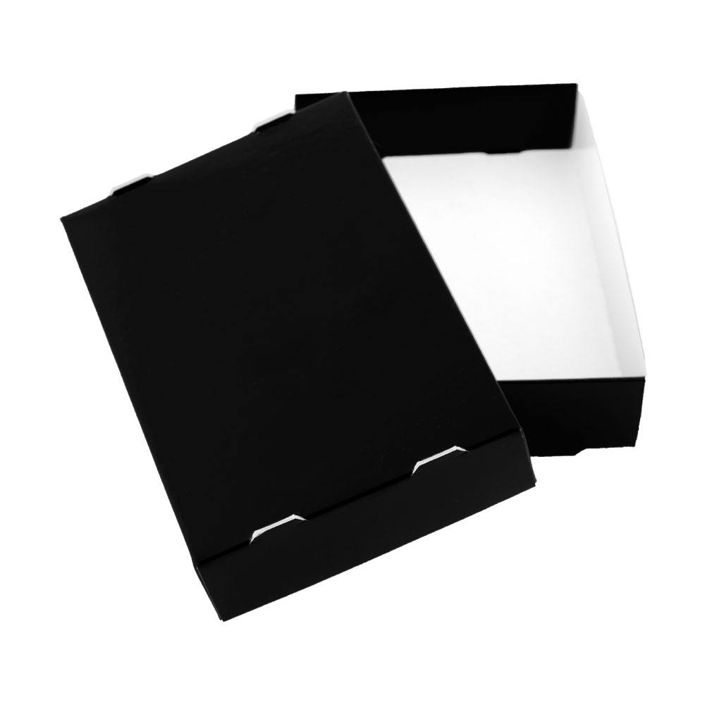 Papírová krabička s víkem skládací rozměr - 215x302x40 mm gramáž papíru - 600g/m2 barva - černá poskytujeme množstevní slevy Na zakázku vyrobíme krabičky i jiných rozměrů a barev