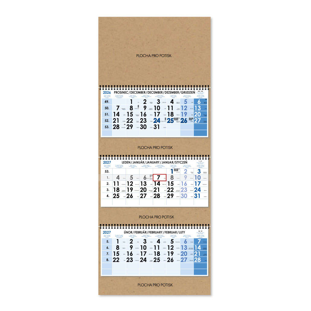 Tříměsíční kalendář Trio Kraft skládaný český se spirálou 2027 - modrý